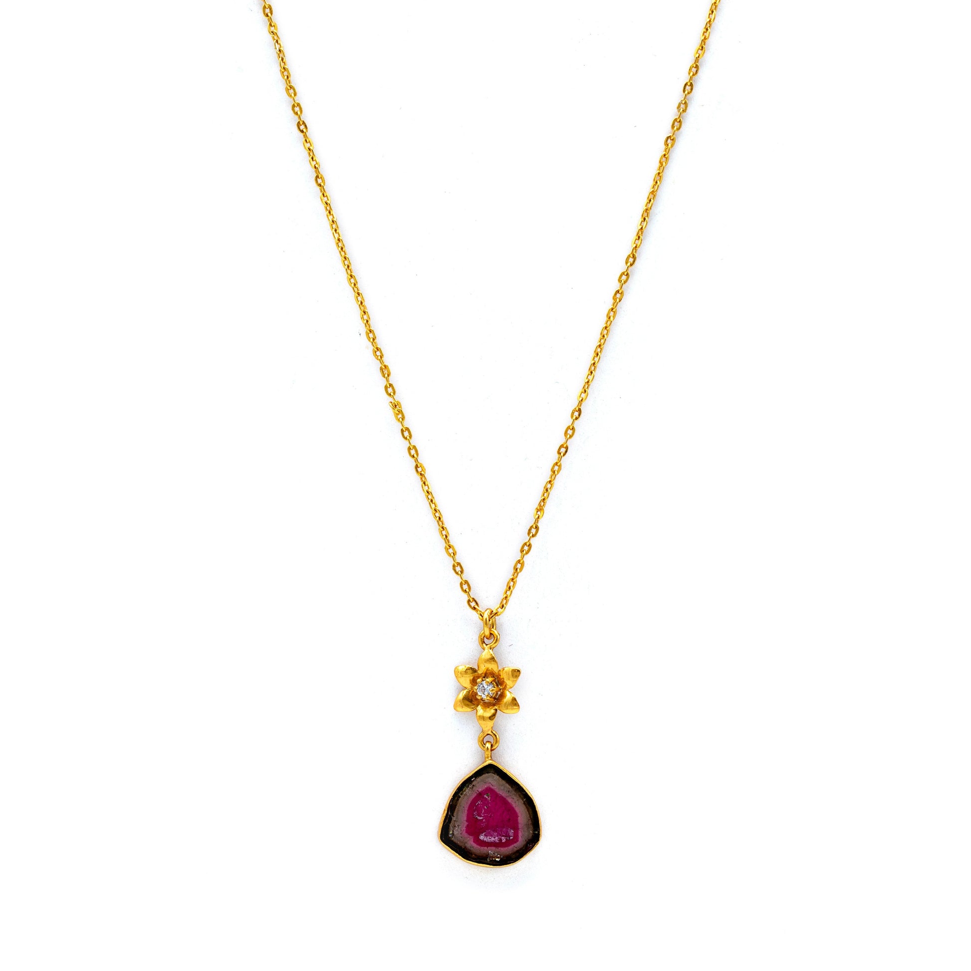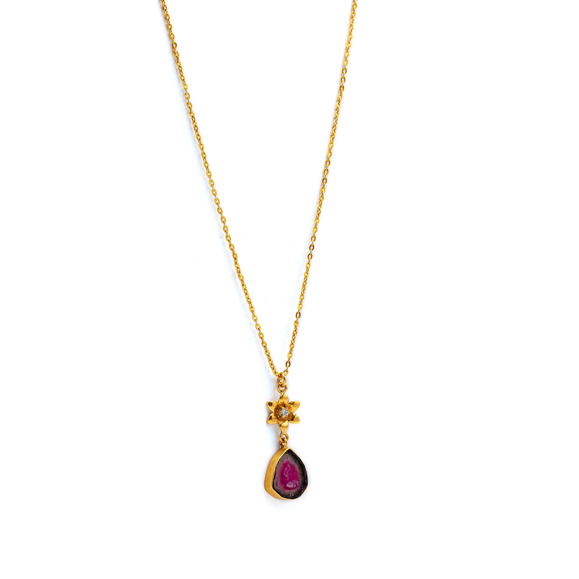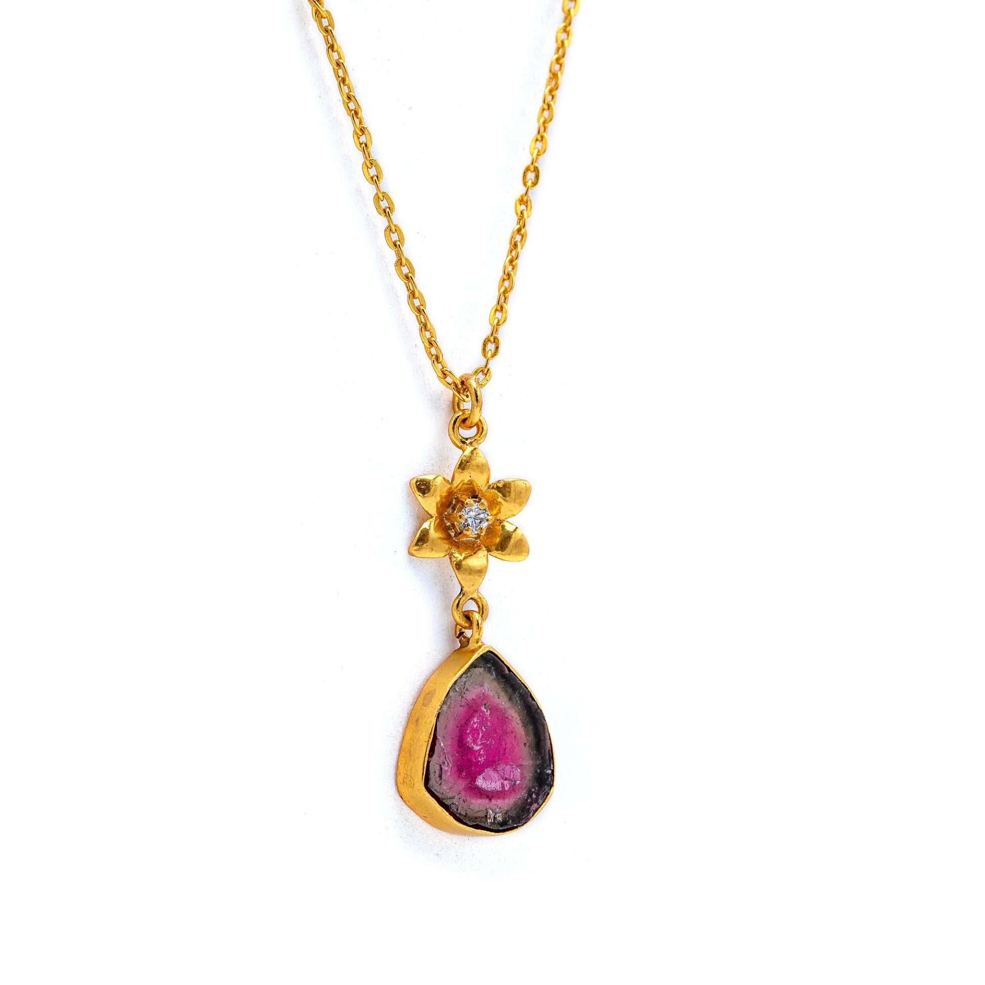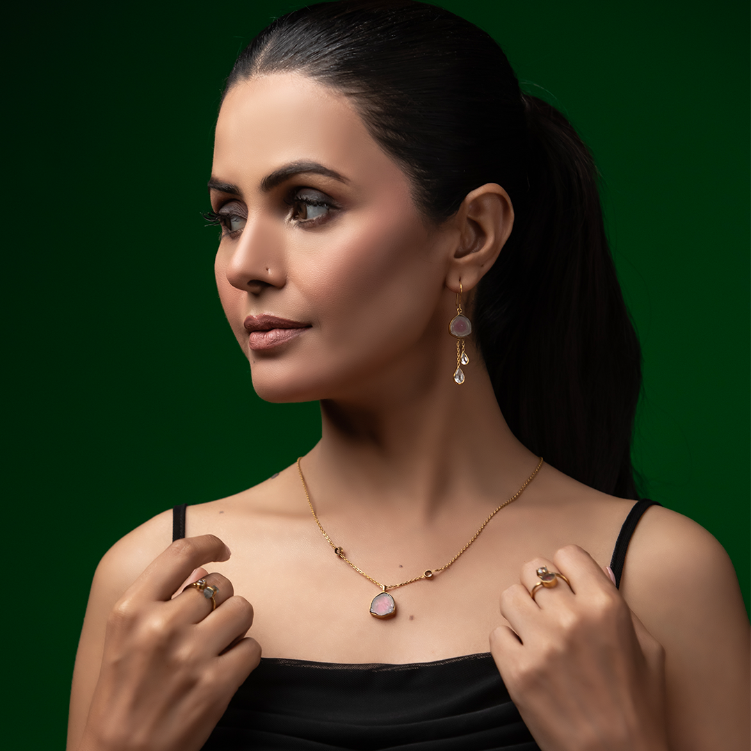 Each Tourmaline stone is unique, shaped by the ancient mountains it comes from ‰ÛÓ its colors deep, grounding, and full of quiet energy. The Topaz-set flower above adds a touch of luminosity, creating a graceful contrast that reflects both femininity and resilience.