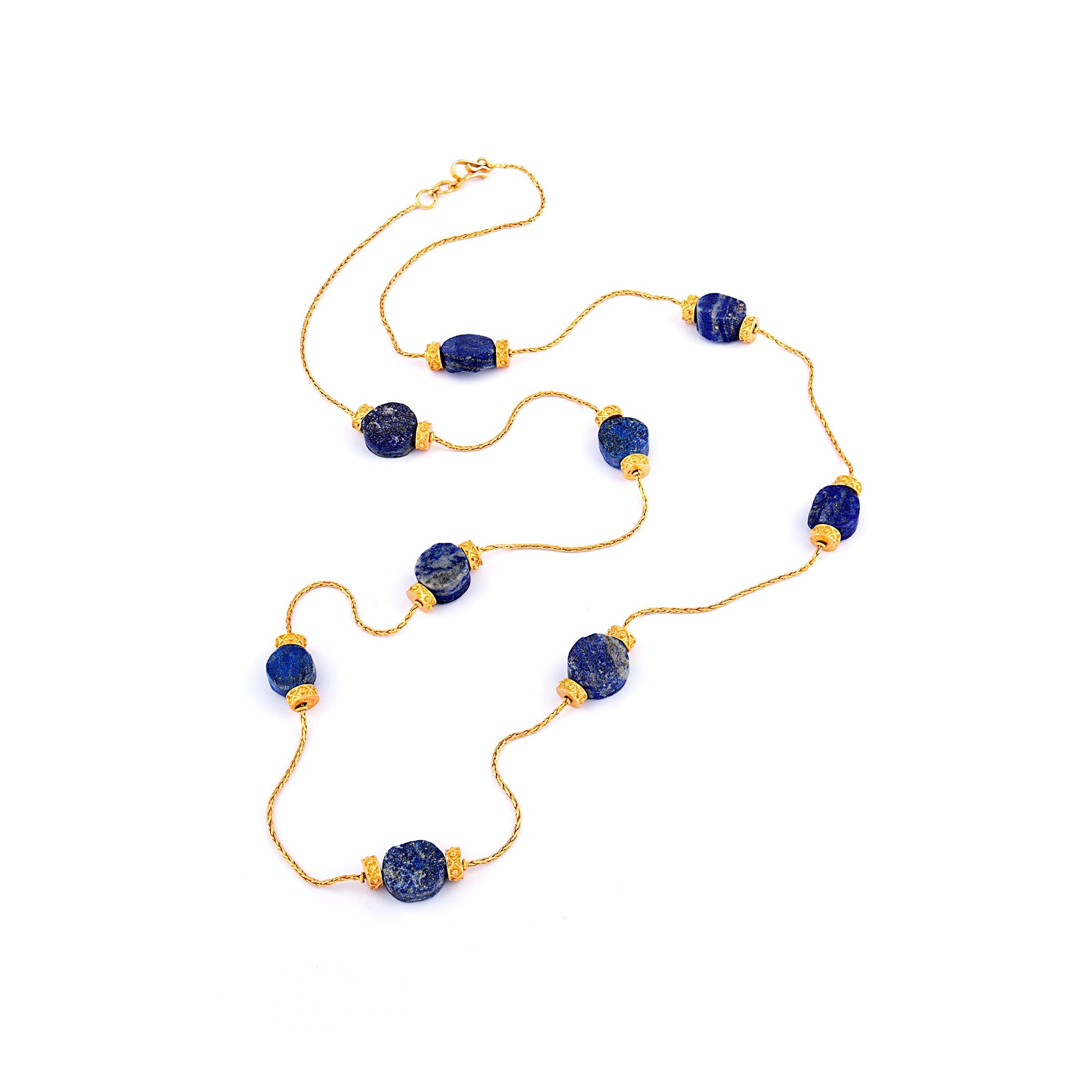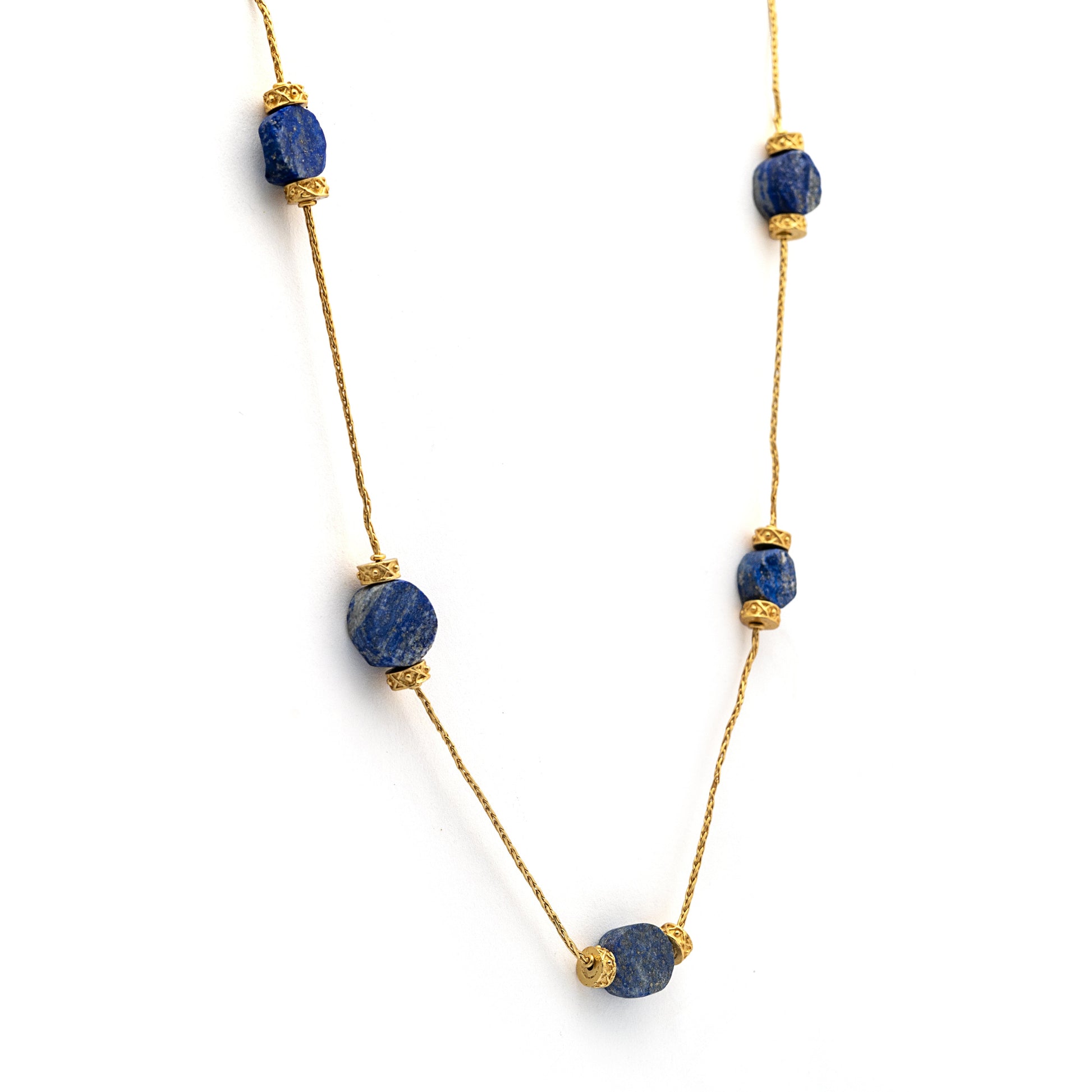 Introducing our 'Lapis Legacy Necklace' from the Himalayan Whispers collection. This exquisite necklace showcases the natural beauty of lapis lazuli, featuring unevenly cut round pieces of this revered gemstone. Lapis lazuli, known as the stone of wisdom and truth, is believed to enhance intellectual abilities, stimulate creativity, and promote inner peace. Its deep blue hue symbolizes royalty and honor, making it a timeless and elegant addition to any jewelry collection. Elevate your style with the Lapis Legacy Necklace and embrace the legacy of lapis lazuli's profound healing and transformative properties.