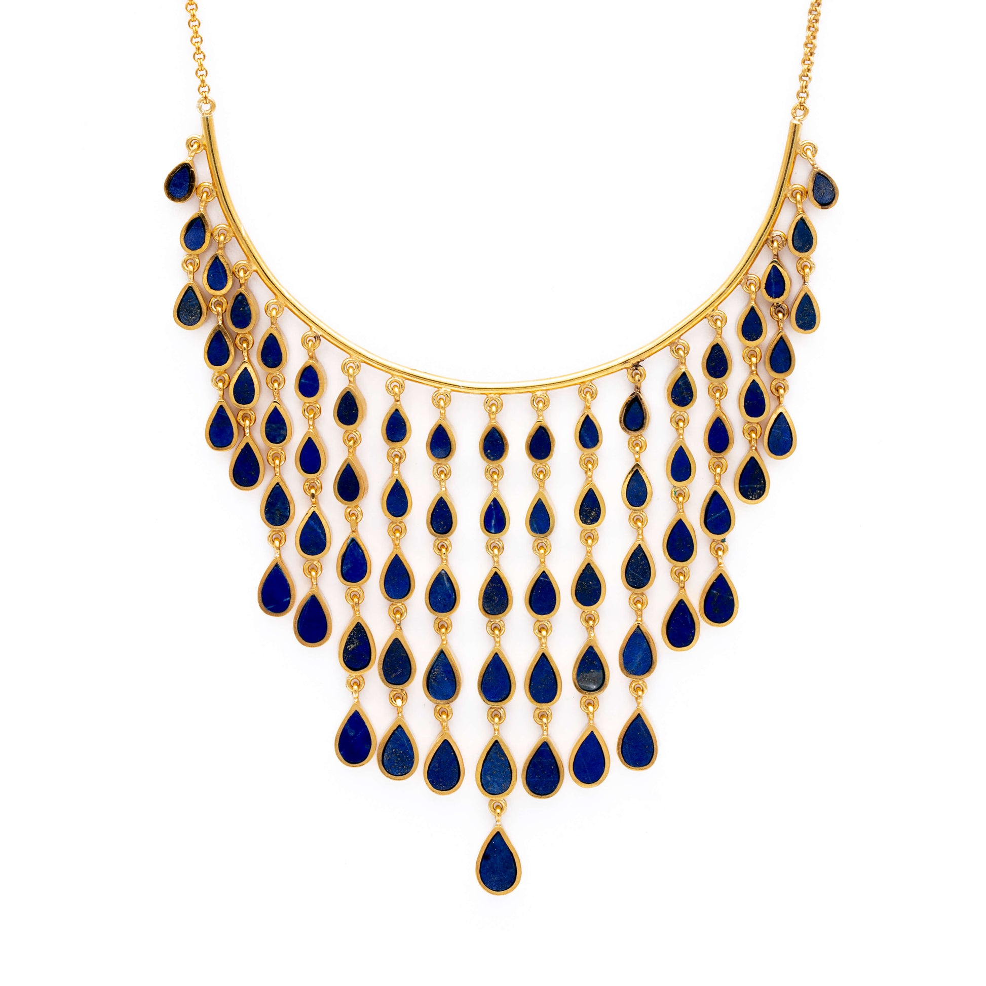Indulge in the mesmerizing beauty of the 'Tear of the Sky' Lapis Lazuli Necklace, a true masterpiece crafted by expert Afghan artisans. Each tear-shaped piece of lapis lazuli is meticulously set together in a stunning silver gold plated necklace, creating a breathtaking display of color and craftsmanship. The deep blue hues of the lapis lazuli stones evoke a sense of celestial charm, reminiscent of the vastness of the sky. With its unique design and meticulous attention to detail, this necklace is a symbol of elegance, sophistication, and artistry.